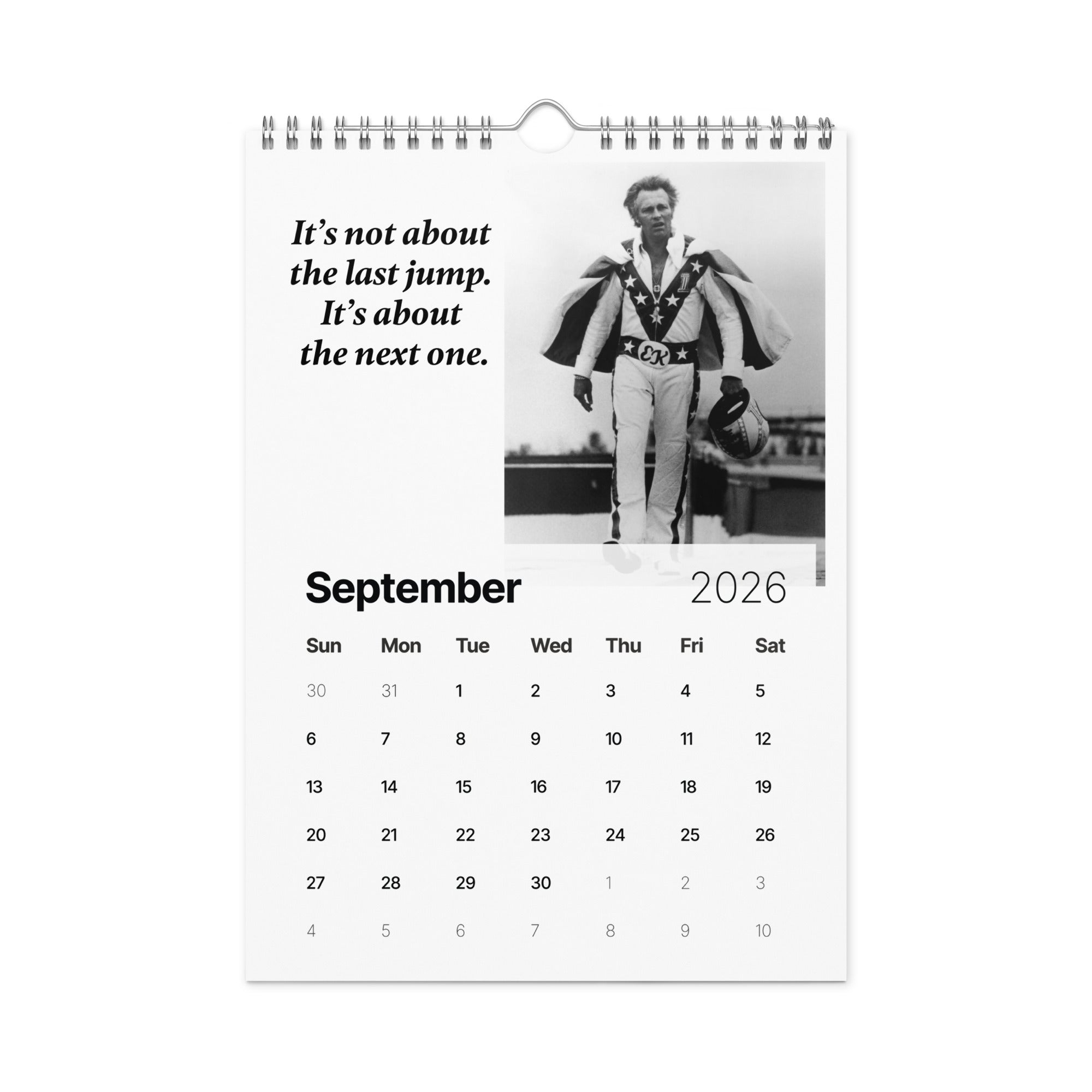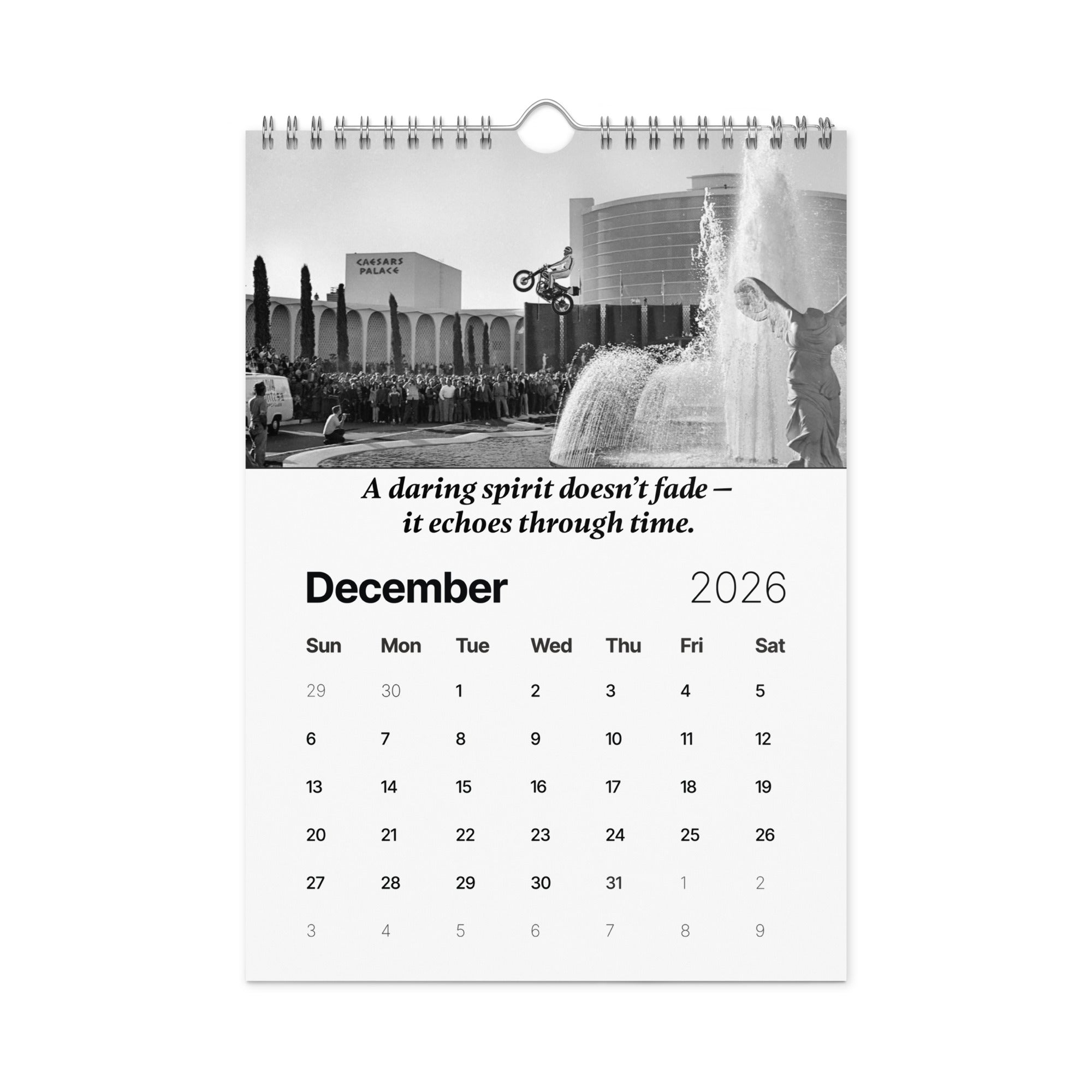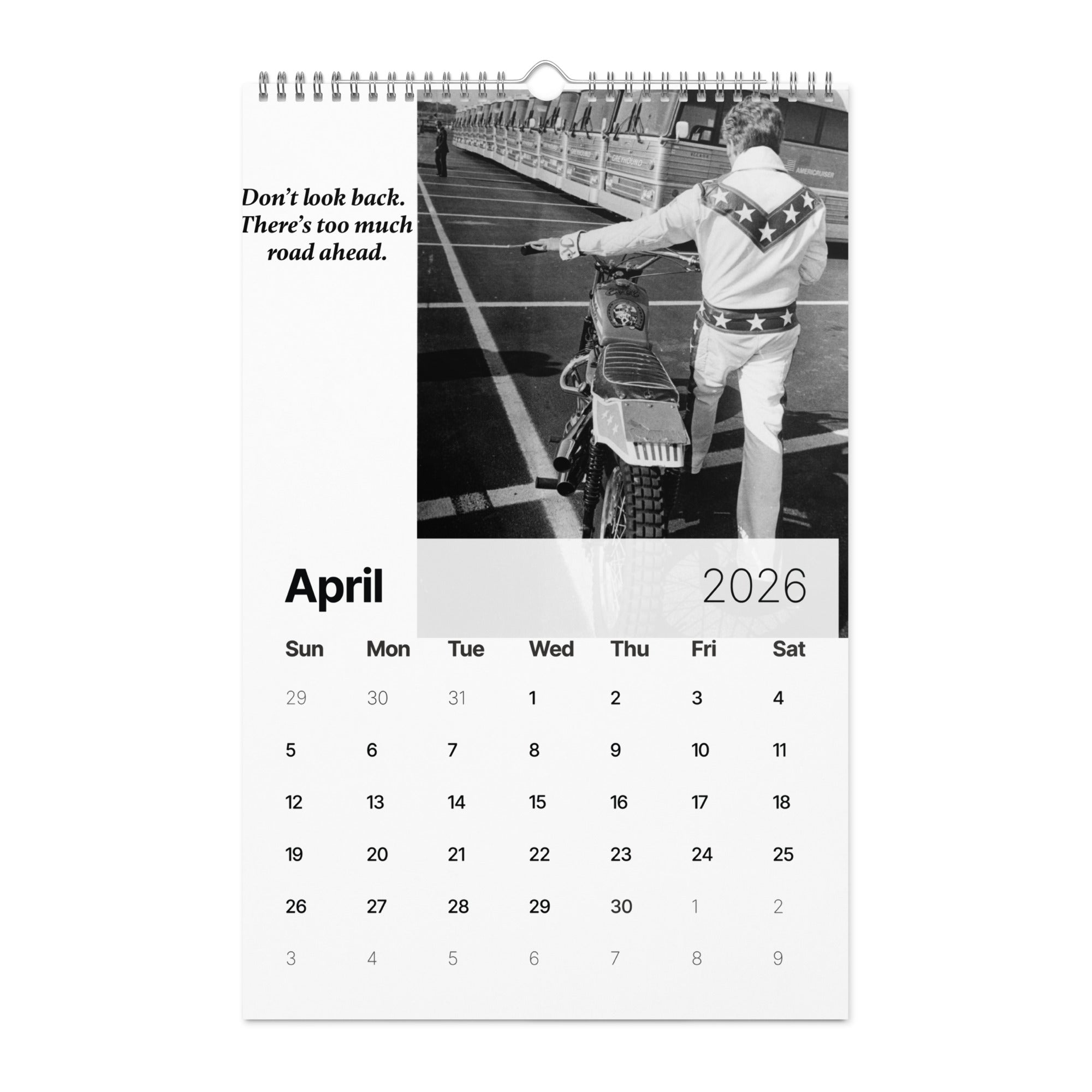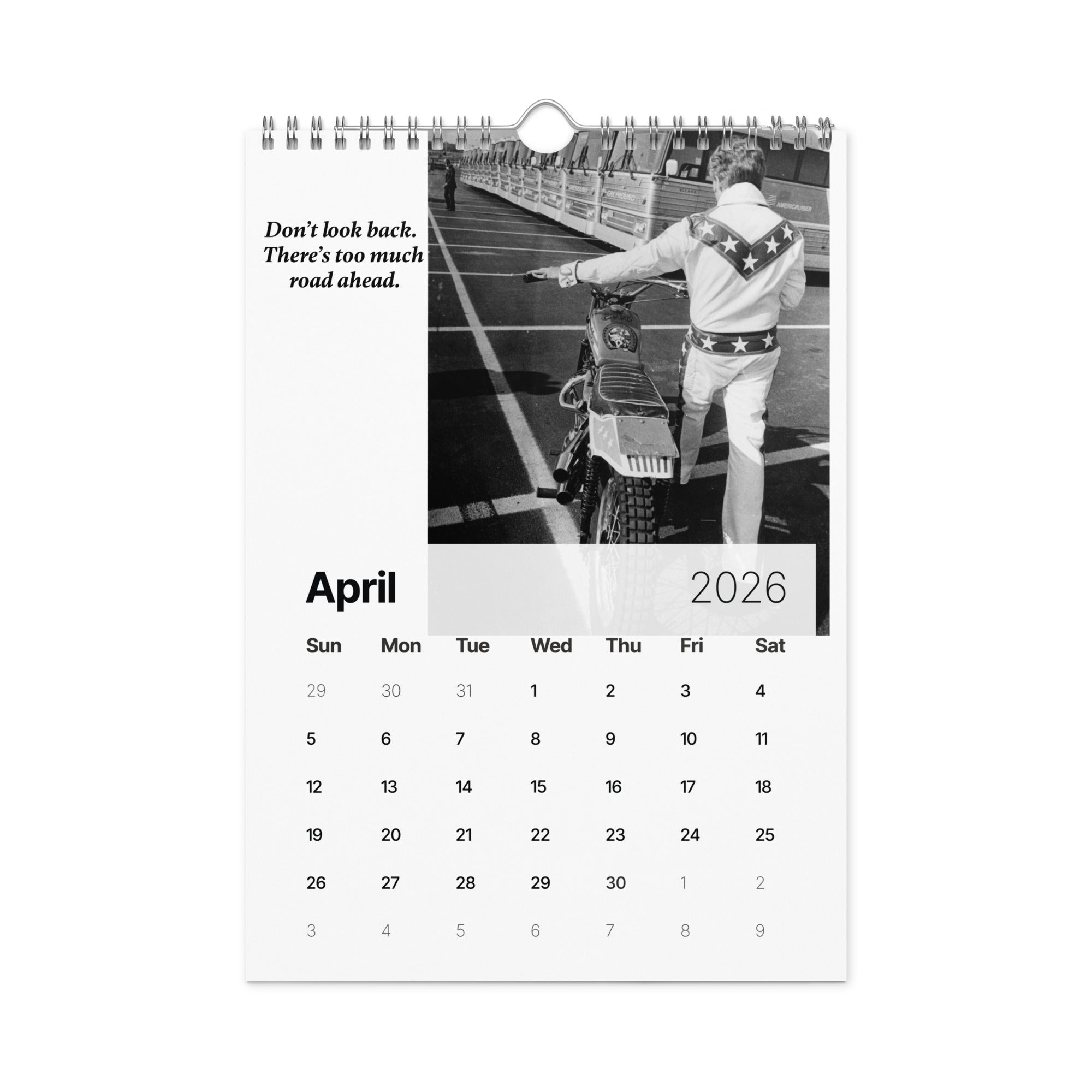 From the man who turned risk into art and courage into legend comes "A Year of Fearless Inspiration from Evel Knievel®. This 2026 wall calendar captures Evel’s unstoppable energy and daring philosophy, blending his iconic pictures with motivational messages that remind us to take the leap, face our fears, and live without limits. A tribute to the legend — and a challenge to every dreamer to ride boldly into the year ahead.