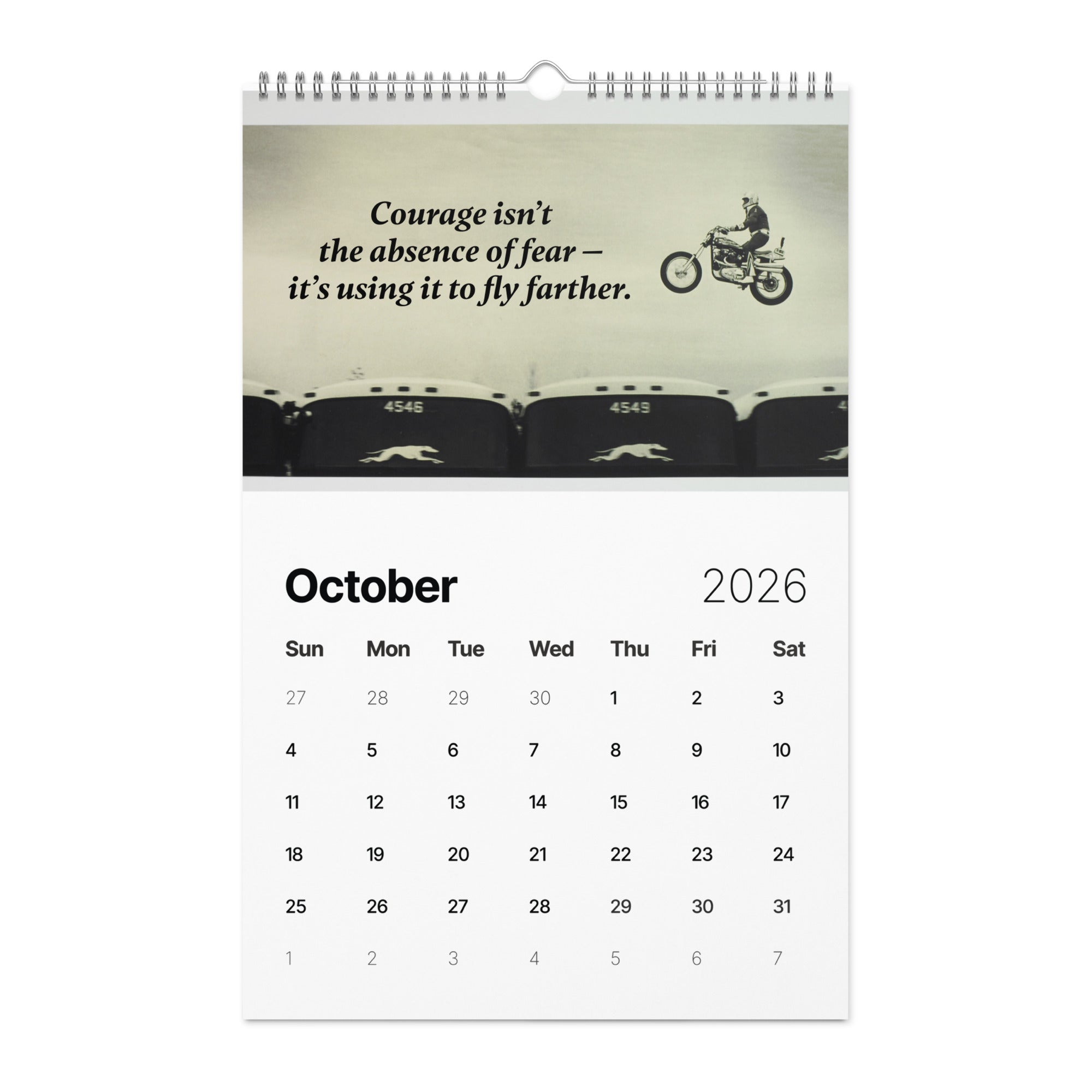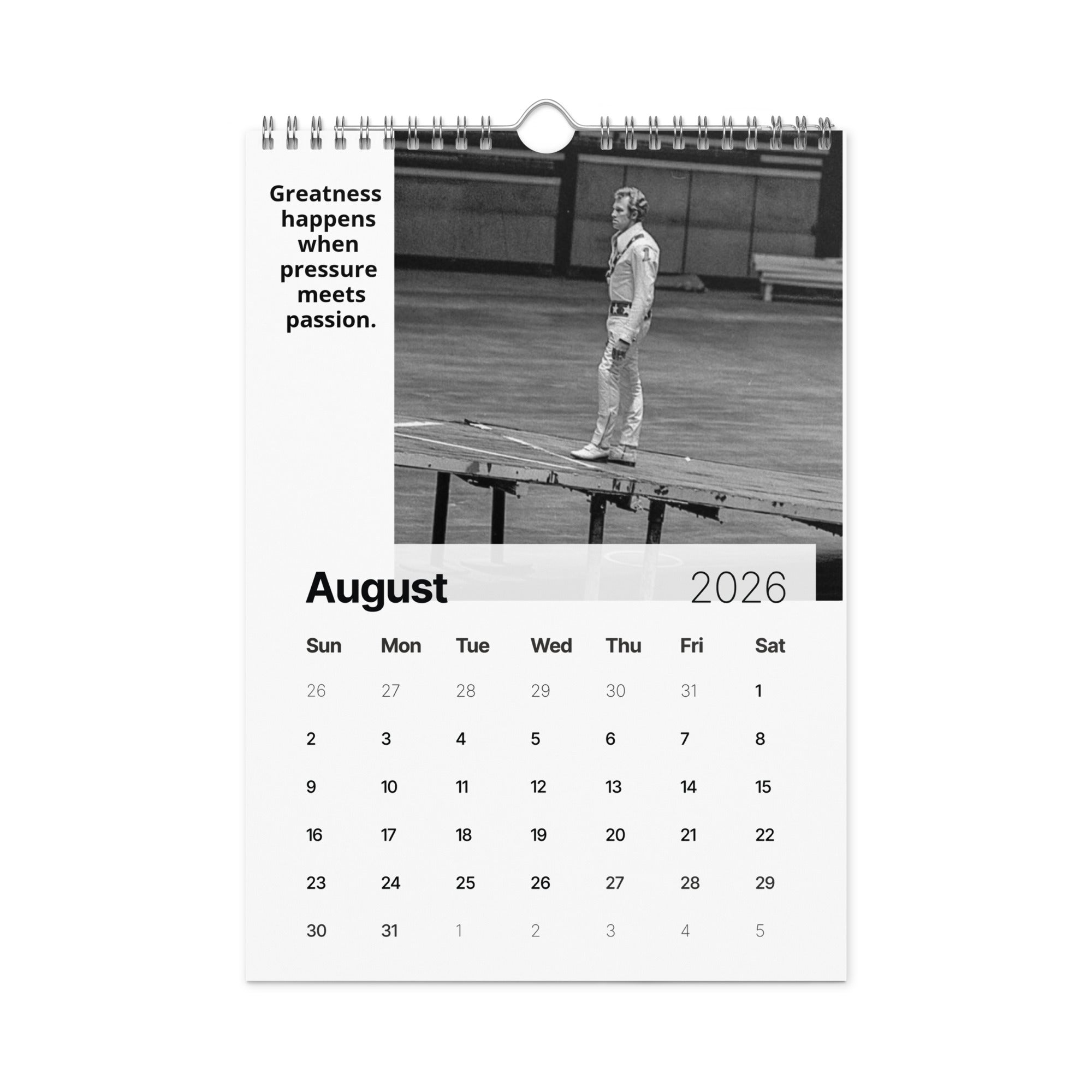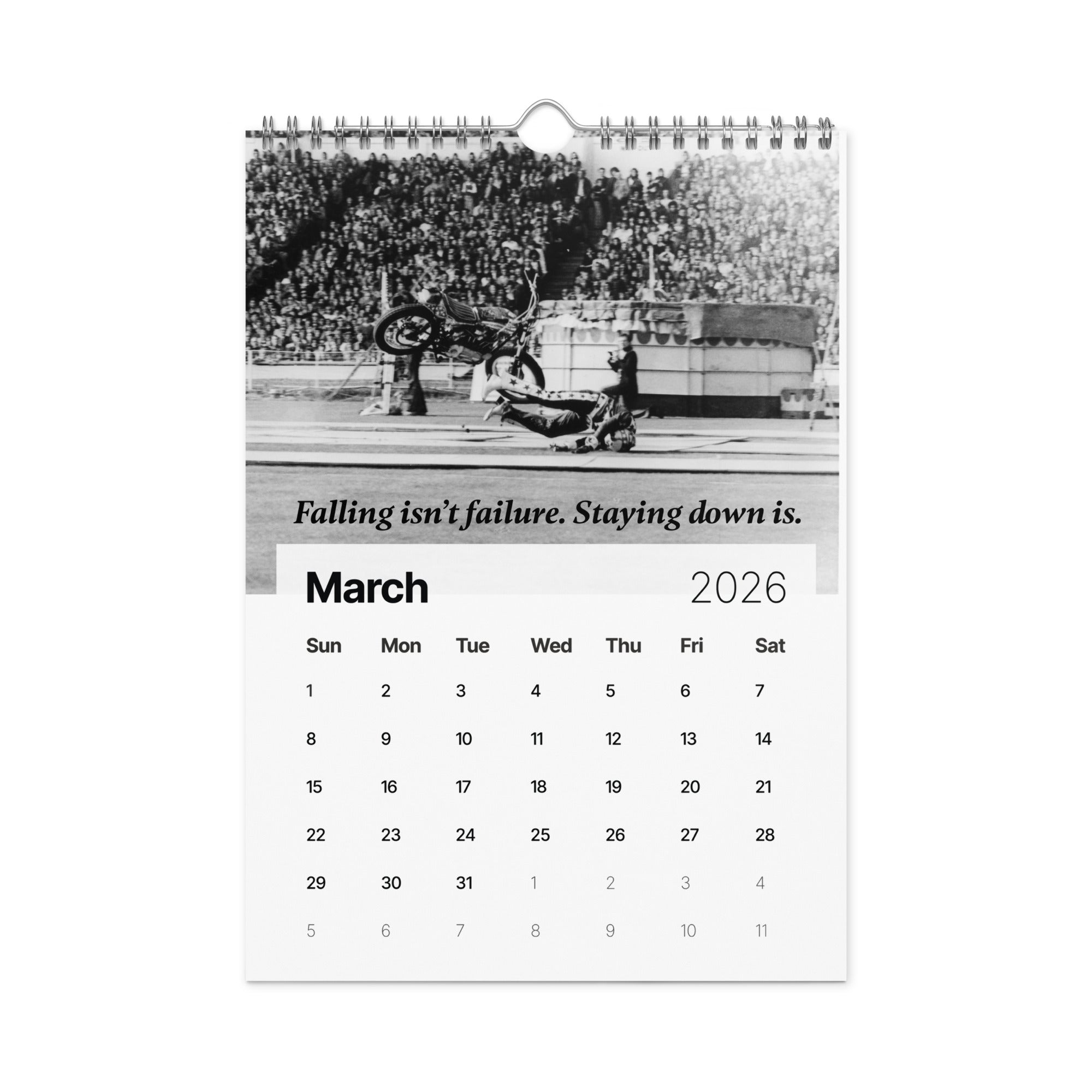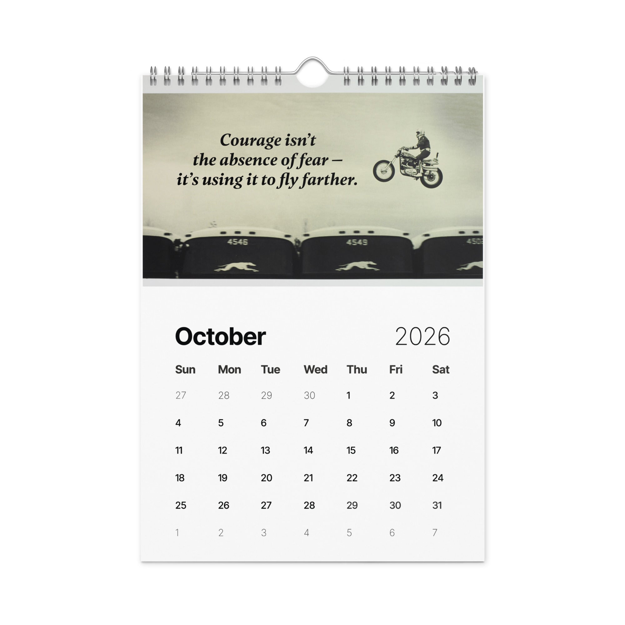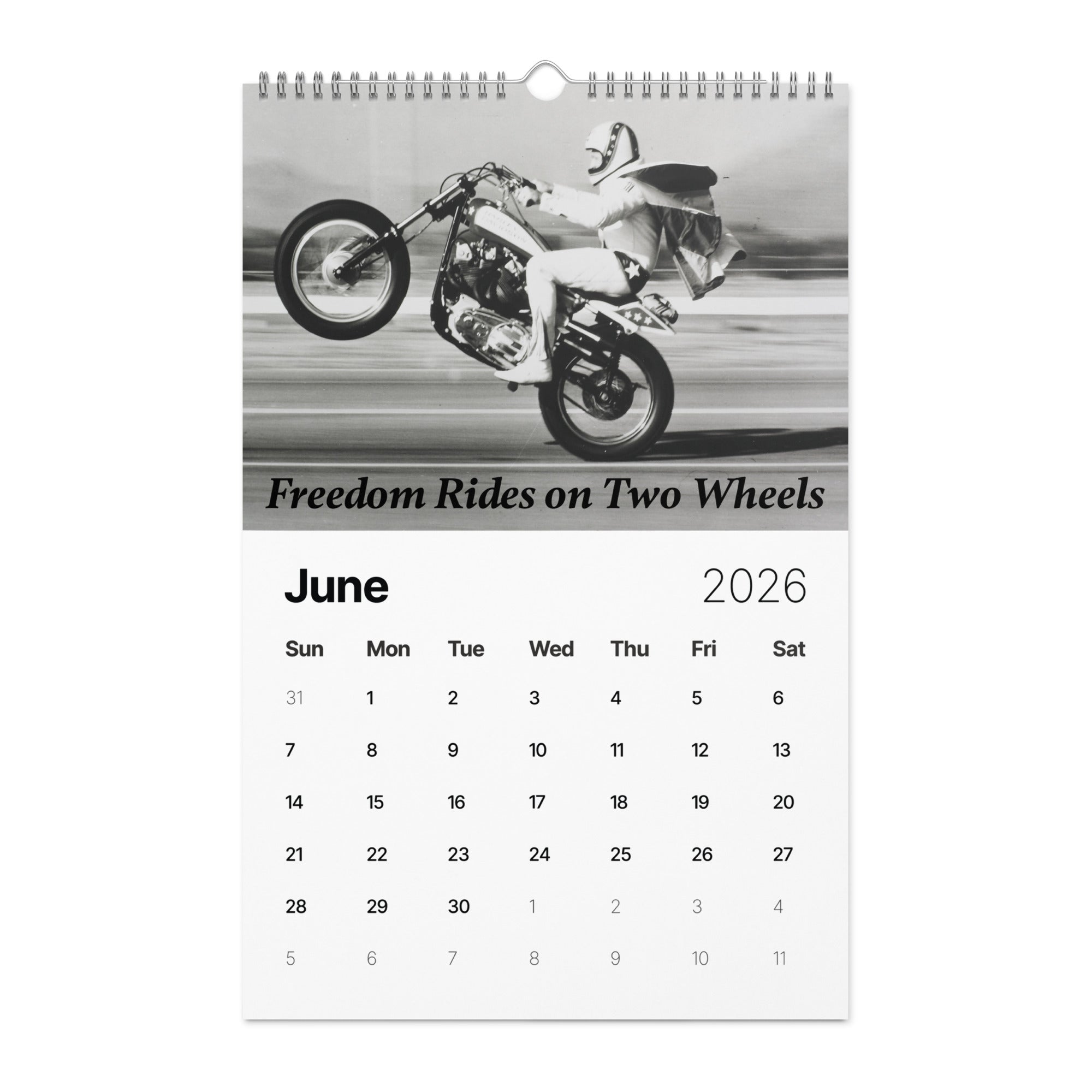 From the man who turned risk into art and courage into legend comes "A Year of Fearless Inspiration from Evel Knievel®. This 2026 wall calendar captures Evel’s unstoppable energy and daring philosophy, blending his iconic pictures with motivational messages that remind us to take the leap, face our fears, and live without limits. A tribute to the legend — and a challenge to every dreamer to ride boldly into the year ahead.