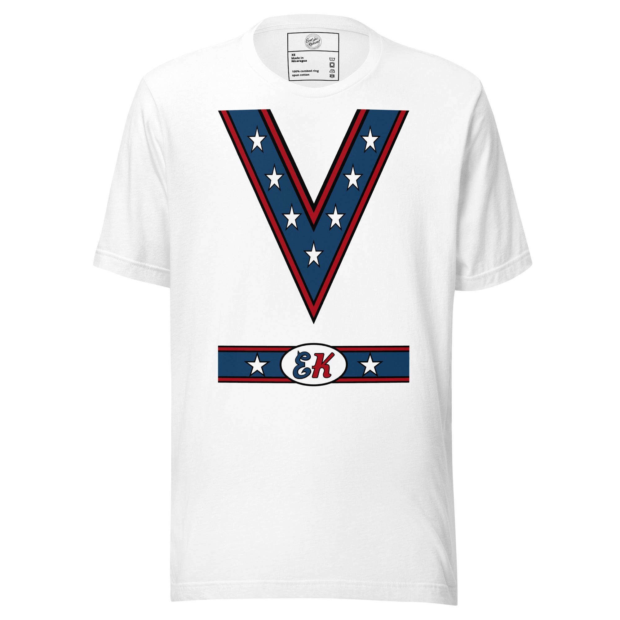 Embrace the spirit of Evel Knievel with our movie costume tee. Or wear it for Halloween! We’re gonna make you an offer you can’t refuse: the best 100% cotton tee you’ve ever tried. Pre-shrunk fabric? Check. Side-seamed construction? Check. Best fit ever? Double check. Evel Knievel...say nothing more.